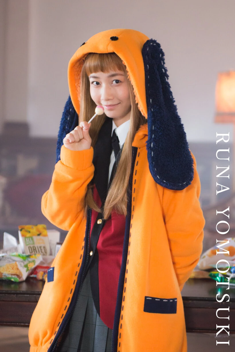 Runa is a very petite girl, having a rather youthful appearance, especially in comparison to other members of the Student Council. She possesses quite a light complexion, long platinum blonde hair with short bangs, split in the middle of her forehead and purple eyes. She wears an orange rabbit kigurumi over the Hyakkaou Private Academy uniform. She has light pink painted fingernails, orange lip gloss, and is often seen sucking on lollipops of various different types and flavors and playing games on a Pink PlayStation Vita (Nintendo Switch with red and green Joycons in live action).