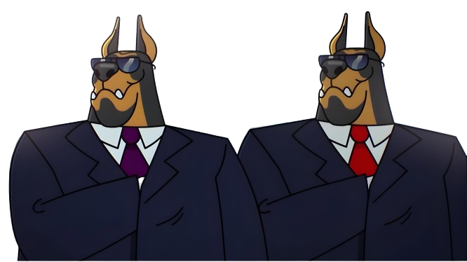 Both are large, muscular Doberman Pinschers dressed in black suits with ties—one wearing a red tie, and the other a purple one. They also sport black sunglasses.