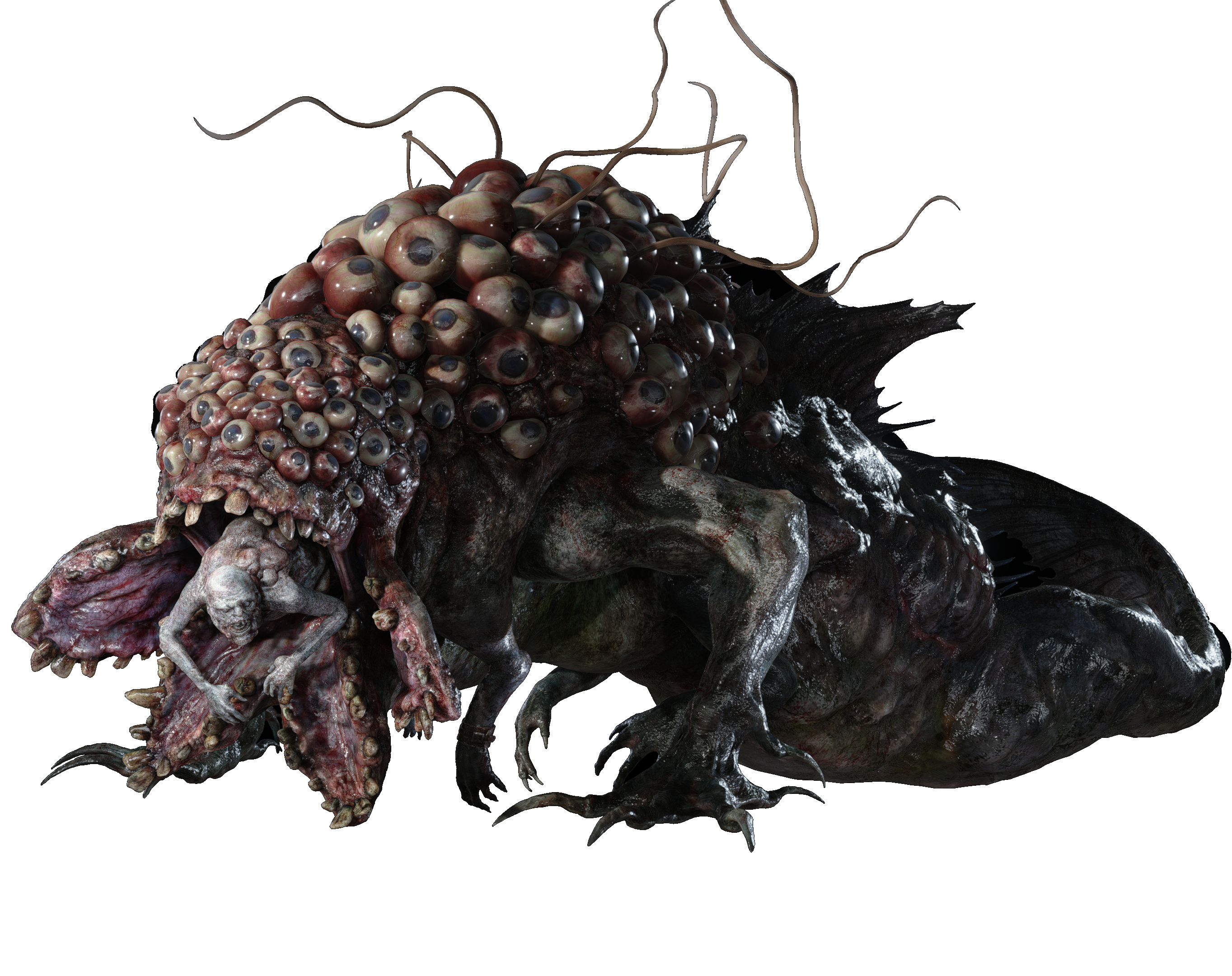 Following his transformation, Moreau becomes a massive semi-aquatic monster resembling both a fish and a salamander, with dozens of bulging black eyes, a maw that splits into four separate pieces, and its tongue being Moreau's original body.