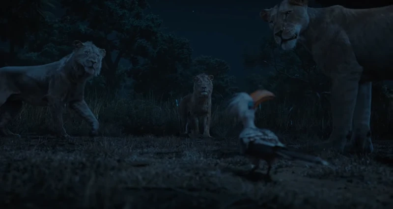 As Mufasa and Taka continued their journey, Mufasa scented a nearby lioness named Sarabi. She confessed that she had been following them in the hopes of finding her pride, which had been decimated by the Outsiders. Though she attempted to leave, Taka stopped her and remarked that he knew what it was like to lose everything, then invited her to join them. She refused and revealed that she was being accompanied by a hornbill scout named Zazu. As Mufasa and Taka moved off to hunt, Zazu urged Sarabi to reconsider their offer, and she reluctantly joined up with them.