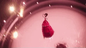 Scarlet and Herb being scared by T-Rex, along with the rest of the cast during the musical number "Revolution".