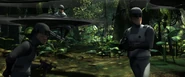 Later on, after Syndrome shoots down Elastigirl's plane, the latter warns her children Violet and Dash about the guards' willingness to hurt children and that it's not like the Saturday morning cartoons they watched when they were younger. She sneaks into the base to rescue her husband. She knocks out some of the guards and locks them in a closet while using their security cards to unlock doors. The next morning, the guards are called to go after Violet and Dash when they accidentally triggered the alarm. They manage to surround them, but Violet using her invisibility to hide and Dash escapes with his superspeed. While one guard stays behind to find Violet, the others chase after Dash who manages to evade them causing their deaths. Dash comes back and attacks the guard to protect Violet, who then uses her force field to shield Dash from the gunfire. They reunite with their parents and fight off the guards, but Syndrome captures them with his zero-point energy ray.