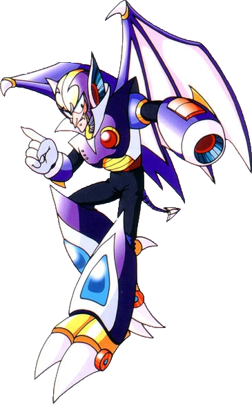 Shade Man is a purple vampire-esque robot who has a pointed nose and ears akin to Waluigi from the Super Mario series. He also has wings and a tail similar to an imp. Shade Man wears purple armour on top of a black shirt and trousers as well as purple boots that have claws. He also has a purple helmet that has a yellow arrow pointing downwards. Shade Man only has one hand which sits on his right arm; Shade Man's left arm has a cannon that lets him fire his noise crush bullets.