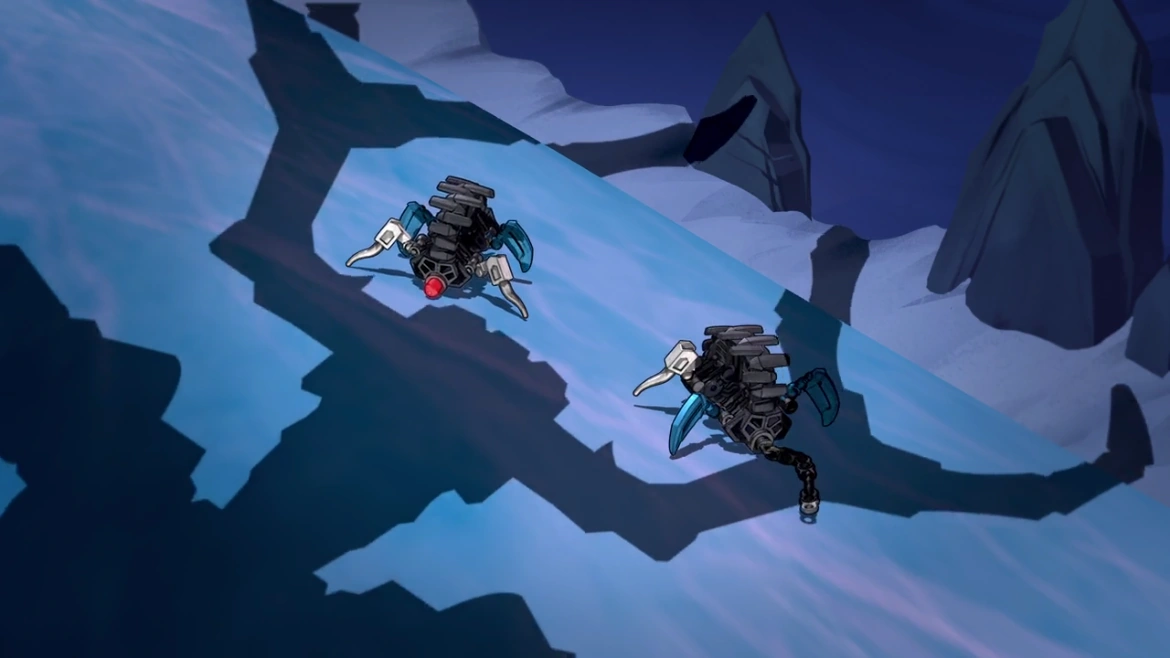 they witnessed the raging battle between the Toa Uniters and the reformed Brotherhood of Makuta before Gali arrived back to the shore with Akida and the help of both Uxar and Akida, the Toa manage to drive all the Brotherhood. Then, one of the Water Shadow Trap suddenly pushed the another one into the water where it swam into the ocean. As the Toa and the two Creatures finally arrive in the Region of Ice to find Melum, Umarak sent the Ice Shadow Traps to capture Melum before the Toa do. However when Melum saw the Ice Shadows Traps.