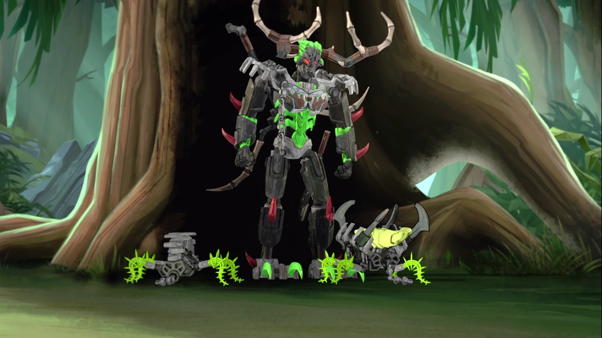 Shadow Traps immediately follow the Toa into the jungle. While in the jungle, two pairs of Jungle Shadow Traps stumble upon the Skull Spider and fought with it. After the brief confrontation, the Jungle Shadow Traps won and one of them grabbed the Skull Spider with its snapping jaw just when Umarak appeared. Upon seeing it, he became angry and grabbed one of the Jungle Shadow Traps and pulled the Skull Spider and tossed it away. Umarak then angrily warns the Jungle Shadow Traps before ordering all the Shadow Traps to prepare to attack the Toa and capture Uxar. The Jungle Shadow Traps then attacked the Toa Uniters when they nearly reached the Temple of Jungle where Uxar was. Despite in large numbers, the Toa eventually defeated all the Jungle Shadow Traps and the other Shadow Traps. Later after tha Toa Uniters have arrived into the Region of Water, the pair of Water Shadow Traps appeared on the cliff near the Temple of Water as