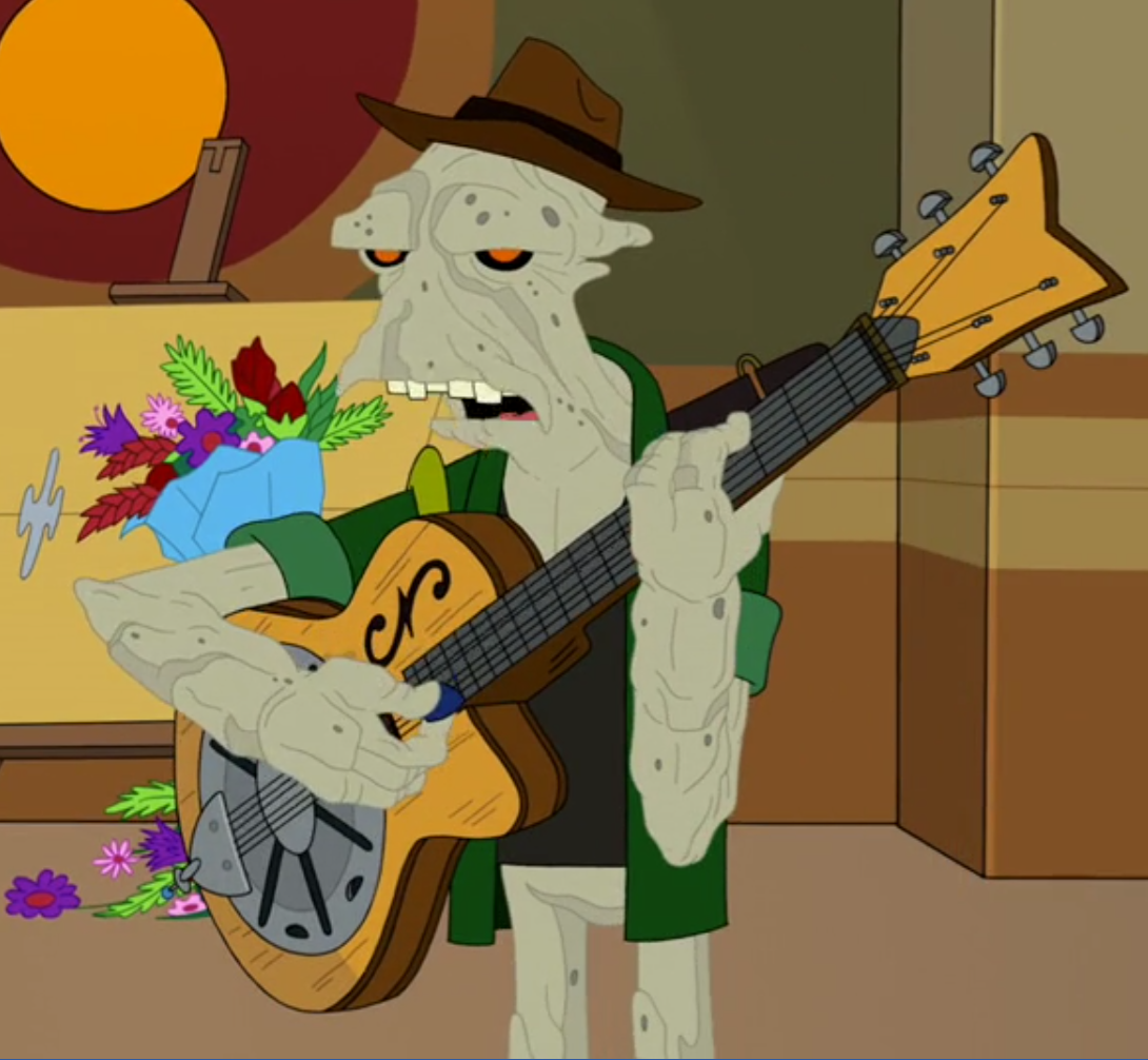 At T.G.I. Folky's, Silicon Red got ready to perform a song before Bender came up and immediately cut his performance short to do his own song, which he called "The Ballad of Me (Ramblin' Rodriquez)". Sadly, Bender was booed offstage and Red told him that his song lacked sincerity, given that he never actually experienced the fictional story told in his song. Red told him to get off the stage and leave. He also reminded Bender to not get himself sent to prison, as that was his schtick.