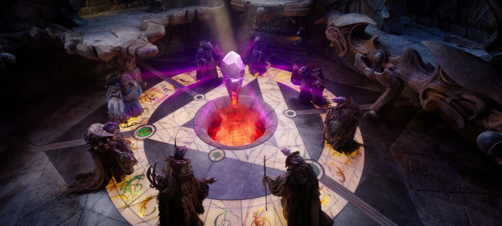 A Great Conjunction soon occurs as the Castle of the Crystal is broken and divided, separating the Skeksis and everyone else. Aughra panics that if the Crystal is not healed soon, it will stay dark forever; Jen tells her that the shard is half a world away and the Crystal cannot be made whole, and UrSol tells them to have faith, for it is the will of the Crystal. SkekUng, on the other hand, leaps down to their level and declares such will would not cause another age for Thra, but rather an age for the Skeksis. This proclamation of his came too soon as Thurma manages to find the shard and approaches to the Crystal, and the Garthim-Master attempted to prevent her from healing it, to no avail. As soon as she placed the shard, the Crystal abruptly cracks and shatters; both the Skeksis and UrRu were eventually merged back into the UrSkeks, with the exception of SkekSil and UrSol, who both perished due to the Chamberlain being perforated by several fragments of the former Crystal.