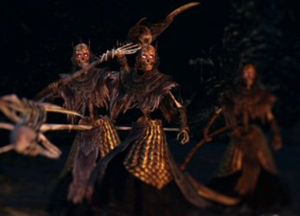 They encounter the Bearer of the Curse at the peak of their power. Each lord wields a different weapon: the left lord has a scythe, the middle lord has a staff, and the right lord has a halberd. While all three lords are capable of casting pyromancies, they tend to only use it when the player is at a distance. The staff wielder will only use pyromancy while the scythe and halberd wielders tend to use primary combat. Each lord is not that powerful and will only go down in a couple of hits. When defeated, each Skeleton Lord will summon a group of skeletons: the scythe wielder spawns normal skeletons, the staff wielder spawns armored skeletons, and the halberd wielder spawns bone wheel skeletons. Defeating all three Skeleton Lords and the hordes that they summon will end the battle.