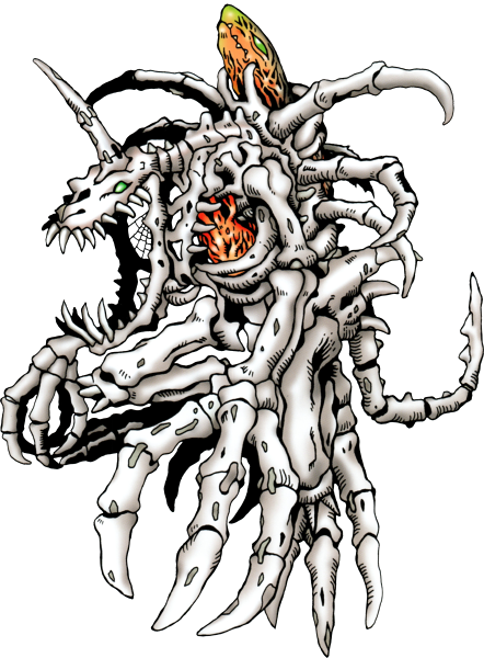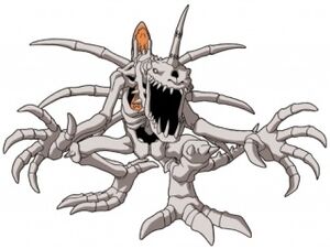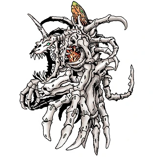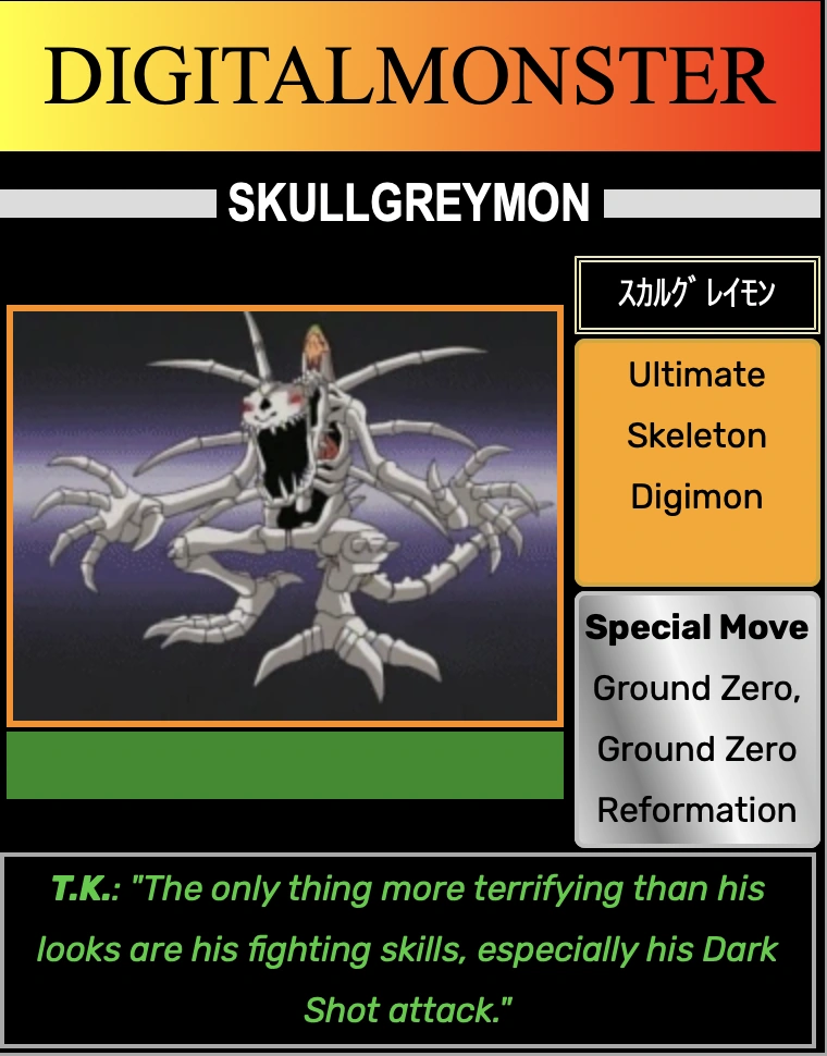 A skeleton-based Digimon from which his entire body is nothing but bone. A SkullGreymon is formed when a Digimon spends too much important time fighting, eventually preferring to live only through his or her fighting instinct even after his or her death. SkullGreymon has no intellect at all but plenty of fighting instinct, and his entire existence alone poses a threat for other Digimon. His special attack is "Ground Zero", which launches an organic missile from his spinal cord.