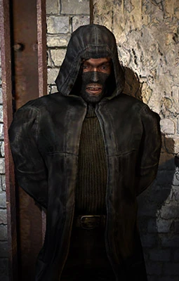 Unlike most Loners, Snitch's appearance is rather unusual: He wears a popular among Bandits leather trench coat that consists of a turtle-neck inner jacket, pants with fingerless gloves and a ski mask that covers his face.