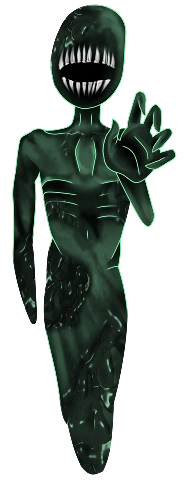 Specimen 2 is a semi-solid, humanoid figure that is dark green in color with a bright green outline. Various bits of its body appear to be of a gel-like substance, while the rest is solid. It has a somewhat emaciated appearance, shown by its protruding rib cage and collar bones. It lacks a face, save for a lipless, open mouth, which shows its long teeth. It has no legs or feet, and its torso simply extends downwards, ending in a rounded shape. Its left hand is always held up, as if reaching for the player, while the right arm ends in a rounded stump at the wrist.