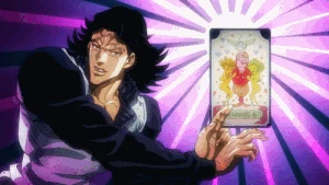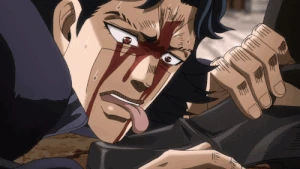 Meanwhile, Dan has been taking advantage of the situation to abuse Jotaro. He forces Jotaro to make himself into a human bridge across a ditch, and to polish Dan's shoes. He then forces Jotaro to try to steal a necklace from a jewelry store only to rat Jotaro out and get him beaten by the store-owner's friends. Throughout all of this Jotaro retains his stoic calm and even seems elated, as he says he's been keeping a list of everything Dan has done to him and is going to pay him back in full.