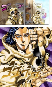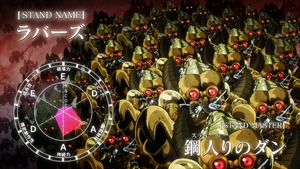 Jotaro immediately attacks the man, but his punch somehow causes Joseph to be sent flying as well. Steely Dan explains that his Lovers is a small and weak stand but with a dangerous special ability: it can infest a human's brain, at which point any damage felt by Dan is amplified and sent to that person. Jotaro threatens to kill Dan too fast for him to feel it and send the pain to Lovers, but the others don't want to take the risk. Joseph, Kakyoin, and Polnareff flee from the scene while Jotaro stays behind to keep an eye on Dan.