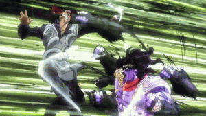 However, this turns out to be just one more trick. As soon as Jotaro releases Lovers, Dan sends it into the ear of a little girl who was playing with her friends nearby. He pulls out a knife and tells Jotaro not to move or else the kid will die horribly. However, as Dan prepares to stab Jotaro he finds that he can't move. Heirophant Green had actually had a tendril tied to Lovers' leg the whole time and has now bound it up entirely.