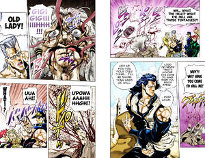 As they run, Joseph explains his plan. Kakyoin and Polnareff will make their stands shrink to microscopic size and go into Joseph's brain as well. Joseph will use his stand, Hermit Purple, with a television set so they can see what's going on inside. They do as Joseph says and enter his brain, discovering to their horror that a mass of writhing tentacles is already growing inside Joseph's head while Lovers is kneading brain matter into goo and feeding it to the flesh bud. Polnareff's Silver Chariot strikes down the stand. As it dissolves, he remarks on the ease of their victory to Heirophant Green, however Kakyoin points out that the Heirophant Green which Chariot is talking to is a fake. The fake Heirophant dissolves into goo and morphs into Lovers. The original that Chariot sliced in two also reforms into two more Lovers. Countless copies of Lovers appear and attack from all angles.