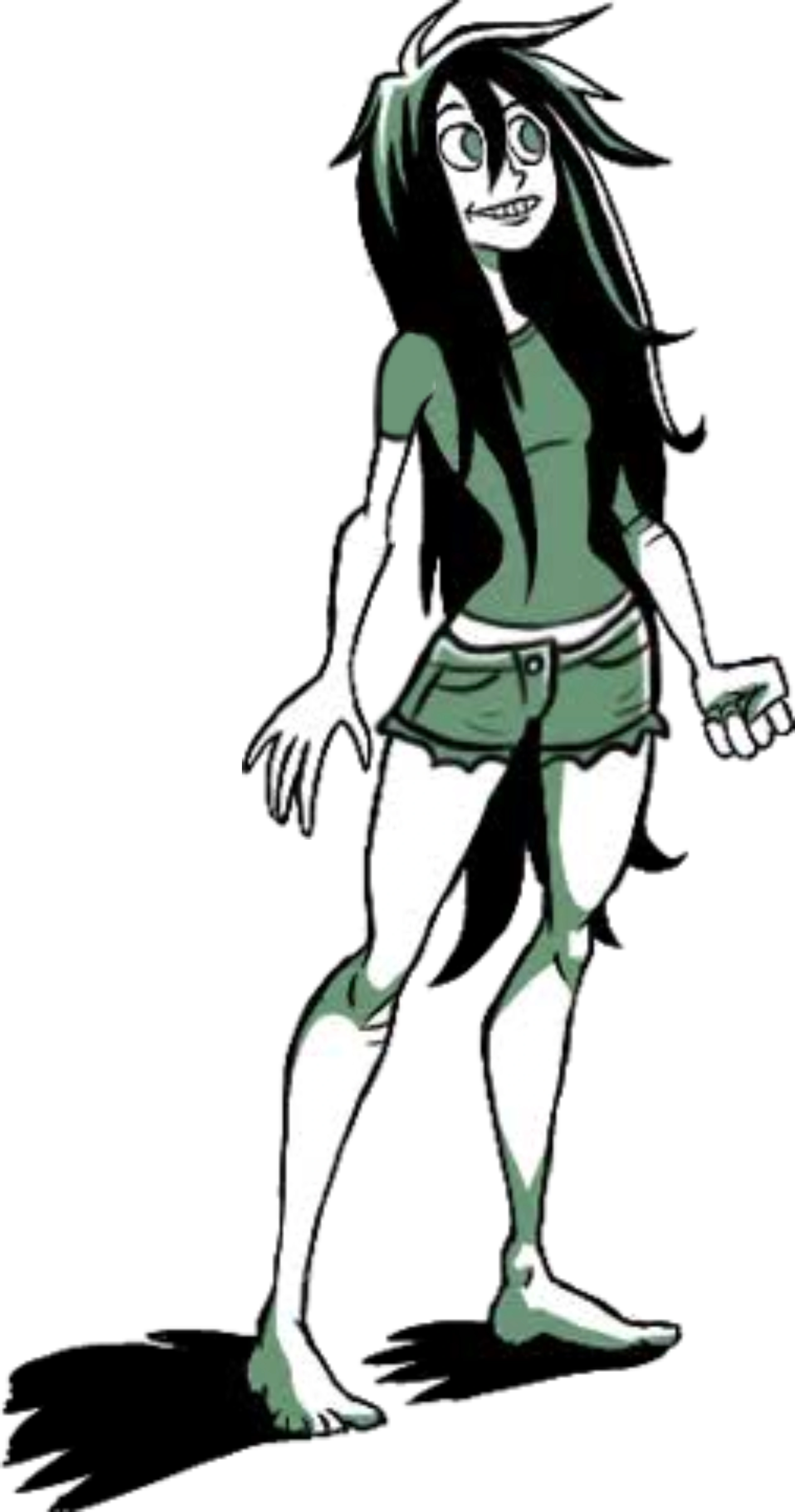 She has extremely pale skin, bright green eyes, and large black hair.