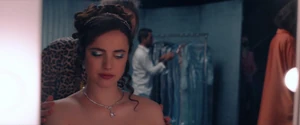 As she wakes up, the solution has indeed worked, but not to the desired effect. Instead, what has come out of Sue's back is a heavily mutated and fleshy abomination called Monstro Elisasue, having a mutated mixture of both Elisabeth and Sue’s physical characteristics and presumably respective identities with the former’s consciousness. Still influenced by Elisabeth/Sue’s desire for fame and status, Elisasue decides to go to the New Year's Eve program. She puts on Sue's gown, tearing it heavily in the process, and makes herself "presentable" by putting on Sue's earrings and necklace and using a curling iron on what little hair she has. Elisasue then breaks open a large poster of Elisabeth that has been hanging on her wall throughout the film and cuts out the face in it. She then glues it to her face, puts lipstick on it, and races back to the studio to host the New Year's TV program.