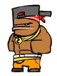 Sunchips appears to be a topless muscled gangster with a cap and a gangster scarf on his head, while he wears a golden chain and orange-yellow pants and gray shoes. His face appears to be very angry while his eyes are totally white.