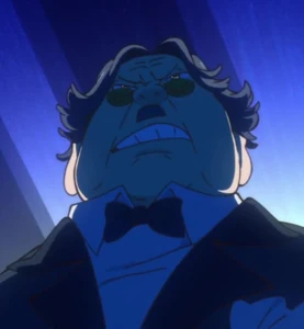 Takiji Kuroido is a man of short stature with short black hair and a mustache. He wears brown sunglasses and a black suit with a bow tie.