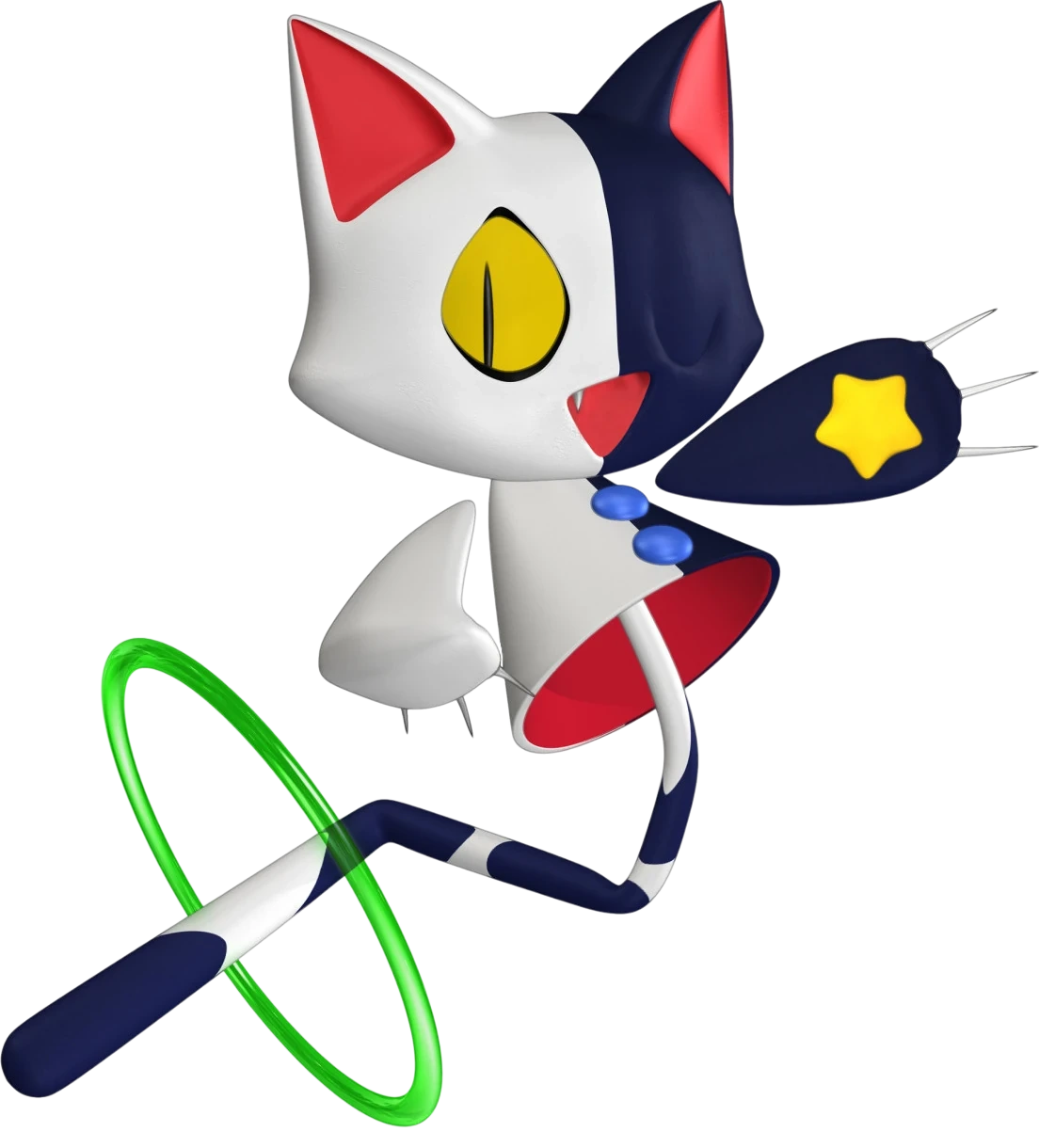 Tat is a catlike creature whose right half is white, with an open yellow eye, while her left half is black or dark purple, with a closed eye. She has a skirtlike torso with two blue buttons. Her arms float separately from her torso, and she has no legs, only a long tail which protrudes from the inside bottom of her skirt-shaped torso and has a green ring around it.