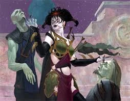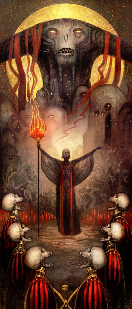 During the Onslaught block, Braids brought Maglan to Aphetto to return him to power and to aid in the construction of the Grand Coliseum. Braids brought the Patriarch a wounded warrior named Jeska that she found in the woods. He attempted to use his killing touch to kill Jeska, but accidentally created Phage in the process when his death magic interacted with her latent planeswalker Spark. The Patriarch fell in love with Phage and gave her a lot of power in the Cabal. He eventually found Phage as a threat and attempted to kill her on numerous occasions. He thought he would finally slay her after rearing their son, but Braid's killed him with a nightmare monster. Now that Phage is in charge, she sought to kill the Illusionist, Ixidor, who sent an army to kill her because she murdered his lover. She sent a death wurm to eat the mage and believed him dead. Ixidor's creation, Akroma, Angel of Wrath, formed a religion to combat Phage and the forces of the Cabal and the two groups squared off. Phage and Akroma fought each other until Phage's brother, Kamahl, used a scythe to try to kill Akroma, but killed both Phage and Akroma and a third woman named Zagorka. Now, Braids is the leader of the Cabal and Karona was born from the three deceased women. The Cabal wanted Karona as an attraction that people would pay to see. But many of its members became insane due to the Mirari and were either killed or trapped in a dementia mage's mental space.