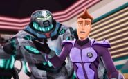 Zemerik (voiced by Michael Dobson) - The leader of the Sark with an Electric Whip for combat. He also has the ability to turn Red Zurk to his command, though the Red Sentients can turn them back. Zemerik's head can also operate independently when separated from his body. He emphasizes logic and considers organic beings inferior. Originally built to lead a Red Sark Army, in The Crimson One, it is revealed that Zemerik gained free will after Vert was sent back in time and uploaded a virus, which allowed Zemerik to betray Krytus, imprison the RS5, and turn the Sark blue. Presently, he has no memory of Vert during that time (possibly due to a side effect of the virus). Zemerik and Zug were the only Sark not under Red Sentient control. In The Blue Tide, they attempted to create a Blue Sark Army resistant to conversion, but the plan failed when the BF5 shut down the Factory Battle Zone that was manufacturing them, thereby forcing Zemerik and Zug back into hiding. In Get Zemerik, he was reprogrammed by a band of Green Zurk, and underwent a radical personality change as well as a slight physical change, which involved his eyes going green and the symbol representing the Alpha Code engraved into his forehead. He then was terminated by Krytus and thrown into a pit. His final fate is undetermined with the appearance of the Old Sark of the Badlands who resurrects the former dictator. He was later freed from the Alpha Code's control and after the events of Full Revolution, he was able to find and revive Zug. Together the two drove off into the distance back to Sark City to possibly rebuild.