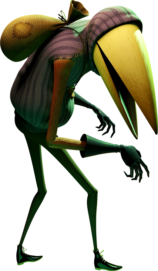 The Thing can also take the form of a slightly obese Mr. Peterson in the attire of a butcher, in this form he can create distracting fake crows that function identically to the real crows that help the kids, see smoke trails left by kids, and can throw meat hooks tied to ropes to grab kids and objects from a distance, as well as opening doors.