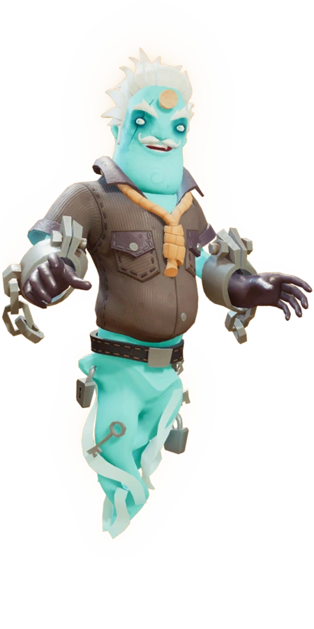 In his fourth disguise it once again resembles Mr. Peterson but as a ghost with blue skin, wild white hair with a white mustache and eyebrows, his legs are missing with chains sporting locks and keys, it wears a gray dress shirt with a black belt and dark gray gloves, his eyes are completely white with a scar over his right eye, and broken shackles around his wrists, it also has a noose around his neck and a cork stuck through his forehead.