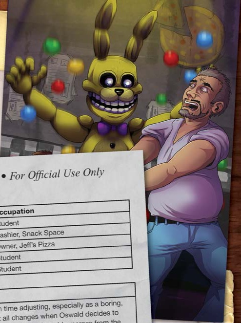 At Jeff's Pizza, Oswald had an argument with his dad and decided to hide in the ball pit. However, upon emerging from the pit, he found himself in the year 1985, in which Jeff's Pizza used to be the establishment Freddy Fazbear's Pizza. After Oswald passed a few days in this time at the past pizzeria, occasionally seeing a yellow rabbit animatronic watching him in the background, one day he heard screaming and cries and watched as all of the customers fled the pizzeria. Then, the Yellow Rabbit lured Oswald in the backstage room, where he saw the bodies of six dead children, put in a sitting position with each wearing party hats. Oswald out of fear went to the ball pit in order to return to his time, while being chased by the Yellow Rabbit.