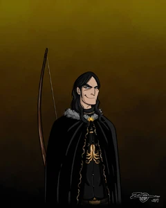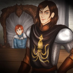 Representing a relative (due to absence of Starks), Theon accompanies the bride, Jeyne "Arya Stark" Poole, to Lord Ramsay, during the wedding ceremony at Winterfell's godswood, in late autumn.