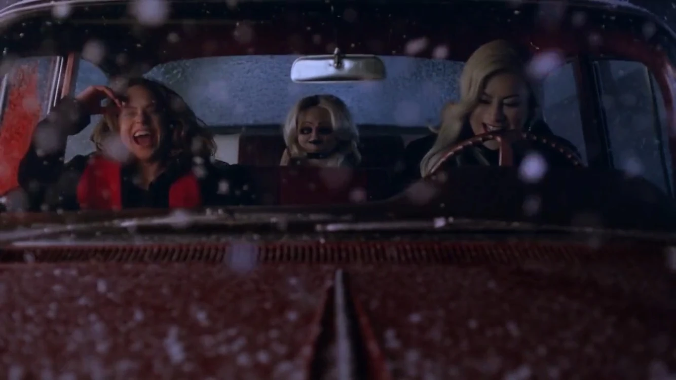 Nica/Chucky, Tiffany and her doll counterpart in their car, laughing evilly