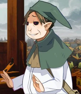 When posing as a humanoid, he is portly and has elf-like hears, light brown hair, pale skin, and eyes with black sclera. His attire consists of a green pointed hat, a white shirt, and a sheath for a sword. It was all due to a concoction he took from Belda to maintain this appearance.