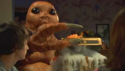 He and his wife acted as bounty hunters and captured two Slitheen members before giving Sarah Jane Smith a plant called Rakweed which they said could survive the harshest conditions and could save millions of lives and end Earth's famines. However this was part of Tree and Leef plan to turn Earth into a Rakweed farm as they were addicted to the plant. But it was later revealed that the plant had a weakness: Ringing noises so thus came in handy for Sarah Jane and the gang to defeat the two. Sarah Jane's computer Mr. Smith causes ringing noises which causes the Rakweed in Tree and Leef's stomachs to be destroyed causing a build up of gas inside the two making them explode leaving nothing but their slimy remains.Clyde Langer called this farting themselves to death.