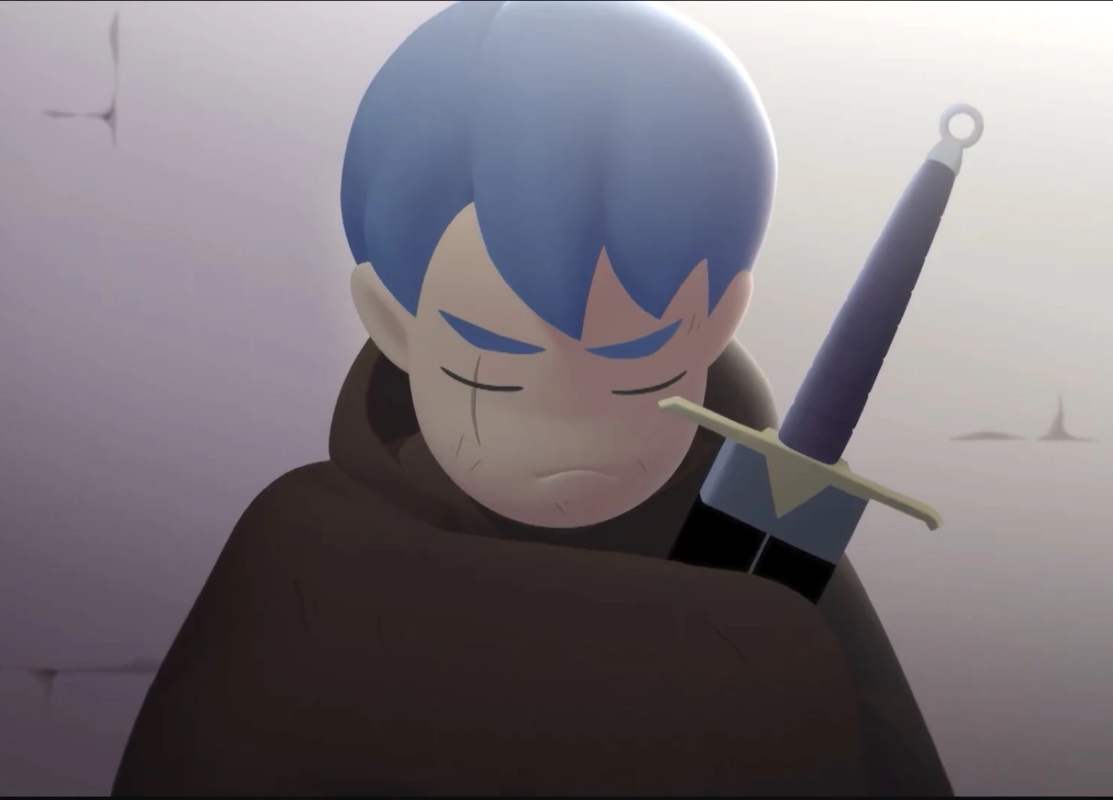 True Brave has deep-blue hair season 1, but gray hair in season 2. He has pink eyes and his right eye is blinded, khaki skin and scruffy face. He wears grey coat and horse boots, deep-purple pants and cloak with a broken sword.