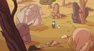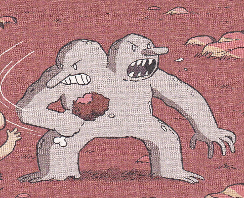 During the next day, while pursuing a guide that Baba’s mom provided for Hilda, Twig and her mother to lead them back to Trolberg, they soon ran into the Two-Headed Troll again as he grabbed them both but with help from Twig and a few Trolls, they managed to get away where the Troll had chased them all the way outside without even realizing that it was still daytime thus he converted to stone. Once petrified, he formed like a boulder which caused a landslide where Hilda and Johanna are soon rescued by the Great Raven or (as depicted in the animated series) by Frida, David and Deputy Gerda plus a white woff. Meanwhile, the Two-Headed Troll had rapidly rolled down from the mountain and came to a stop just at the giant wall surrounding Trolberg. It is unknown what of him afterward as he's never seen again.
