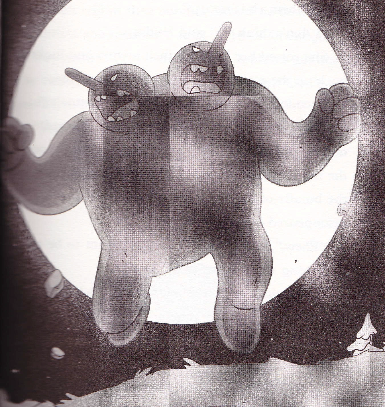 The Two-Headed Troll is first shown while among a bunch of other Trolls while they're all petrified from sunlight, nearby a farmer's house located right outside the walls of Trolberg by Hilda who had been accompanied with both head officer Erik Ahlberg and Deputy Gerda Gustav. They came to life again once after sunset, where he tried to catch Hilda and Ahlberg but fortunately, they escaped through a Vittra tunnel.