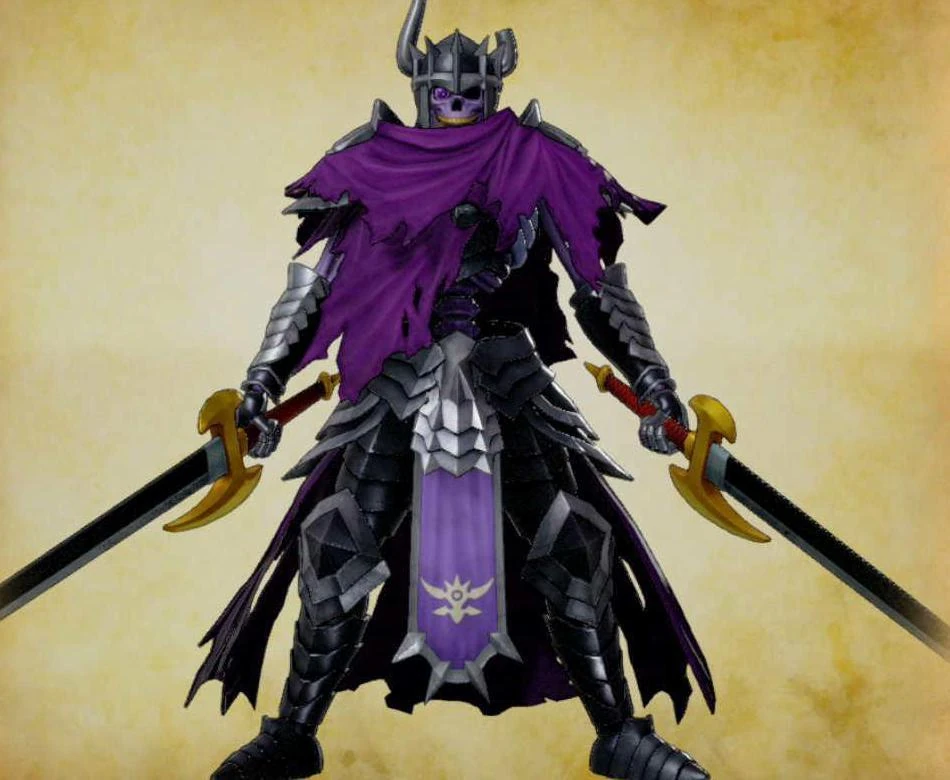 Tyriant is a purple skeleton who wields two swords. He wears a broken helmet, a purple cape and a full set of armor.