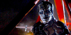 Upon arriving at the construction site, Tzim-Sha killed the site's security guard before climbing up the crane Karl was operating. He later stopped Karl from jumping from his crane onto a neighbouring one where the Doctor was and started to drag him away. The Doctor jumped across and went after him and threatened to destroy his recall device (which would allow him to return home) if he did not release Karl. Believing that the Doctor was bluffing, Tzim-Sha detonated DNA bombs that the gathering coils had placed in the Doctor and her companions eariler, only to discover that the Doctor had transferred the bombs into the coils' data, which Tzim-Sha had downloaded.