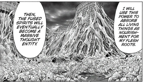 But the thing is... I think Orochi might be one of the worst among these villains. He plays an important part in Psykos's plans to eradicate humanity, he's the one producing these Monster Cells to mutate people into vicious killing monstrosities to boost the ranks of the Association and on his own killed dozens of his own minions, straight up assimilating them to make himself stronger. What I think pushes him over is the fact the mass assimilation plots he and Psykos plan to do on the world. Yes, it was Psykos's idea, but she can't even do this without Orochi, even Tatsumaki mocks her that she has to rely on Orochi for everything. The assimilation in particular has horrifying body horror infliction, living beings being consumed painfully and not even just them, entire buildings and such are getting to eat by the Psyorochi.
