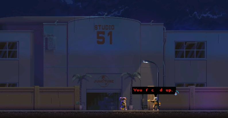 After not finding his psychiatrist on the office, Zero decides to walk home in the rain. However, V finds it and decides to take him on a ride in his fancy limo. He takes this opportunity to finally hang with his hero The Dragon and ask to him what he thought about the tape. V tries to befriend and convince him to kill the prostitutes he got on his car at Studio 51, a clandestine studio where he make all sort of snuff films, but Zero is not interested and insults V, calling him "f-cking subhuman". At the end, V's pride was bigger than his admiration, and dumps him out of the car. In the case you gave your sword to V to cut the drugs he was giving to you, you will have to pass the first part of Studio 51 without weapons.
