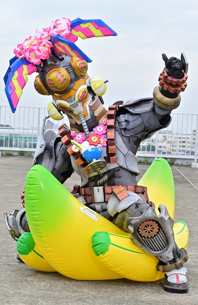 A while later during the invasion one of the Kudakks has spotted Vacances World in an innertube as Kudaiter demands what the heck he was doing which Vacances World told him he's enjoying his vacation since the invasion is over. A while later at the beach the Vacances World shove some of vacationers out of the way declaring that this spot belongs to him and the vacationing Kudakks. This easily ticked Kaito off as he challenges the Vacances World to game of volleyball and if they win then this World monster along with the Kudakks they'll have to find a different spot which Vacances World happily accepts and with that the match was on. Now during the match between Tojitendo and Zenkaiger they used another Sentai Gear this time #5 where they summon the Vulcan Ball as Kaito sent a powerful spike towards the opposing team causing them to fly out of their side of the volley ball court which leaves victory to the zenkaigers. However Vacances World isn't about to given up that easily as he wants to play some more vacation games with the Zenkaigers. They began a game of ring toss with innertubes and the pirates want to join in on the fun. After that the pirates won the game with a total of 7 innertubes and for their victory Gaon used Sentai Gear #44 to create some confetti.