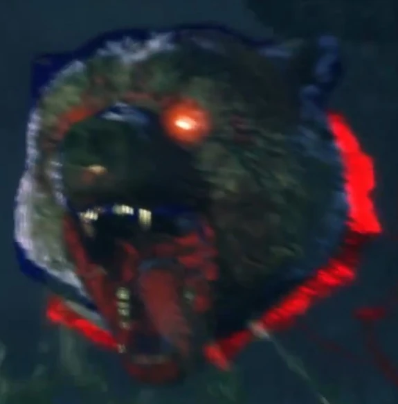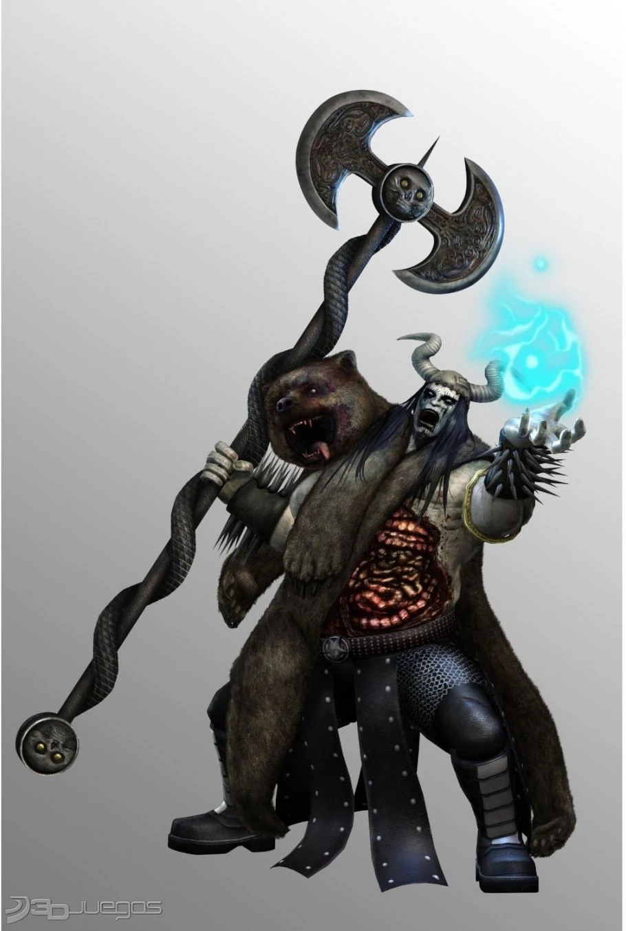 As with the other Dark Purveyors, Vikke's attire is closely tied with his predilect genre of music, noting his helmet with goat horns. His most prominent feature is the large viking axe he holds, which acts as a dual lighting rod system that lets him absorb and control lightning. His second most prominent accessory is Yumil, the living bear pelt draped over his right shoulder, which he uses in his final attack against Juliet. Vikke's eyes are an eerily pale icy blue and are adorned with black makeup underneath them. His skin is a sickly white and he is massive in size, bigger than the other Purveyors. His stomach is split open, displaying his intestines. His helmet also appears to be stapled on.