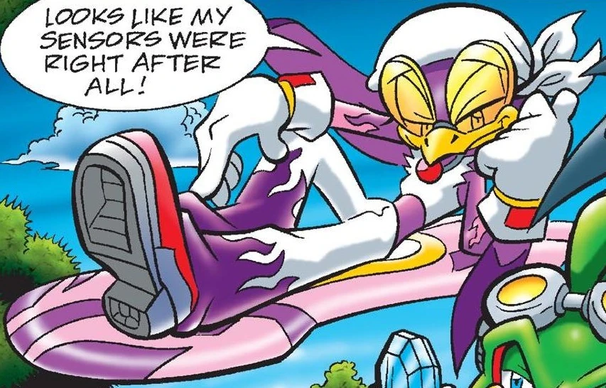 Wave's temporary employment with Dr. Eggman started after Jet the Hawk was captured while using his Extreme Gear to steal a vapor accelerator. Jet cut a deal with Eggman, and brought along Wave and Storm the Albatross as they approached Knothole, setting off an alarm that drew out Sonic the Hedgehog. Keeping up with the Hedgehog despite his speed, Wave joined her teammates in landing blows on him before introducing herself.