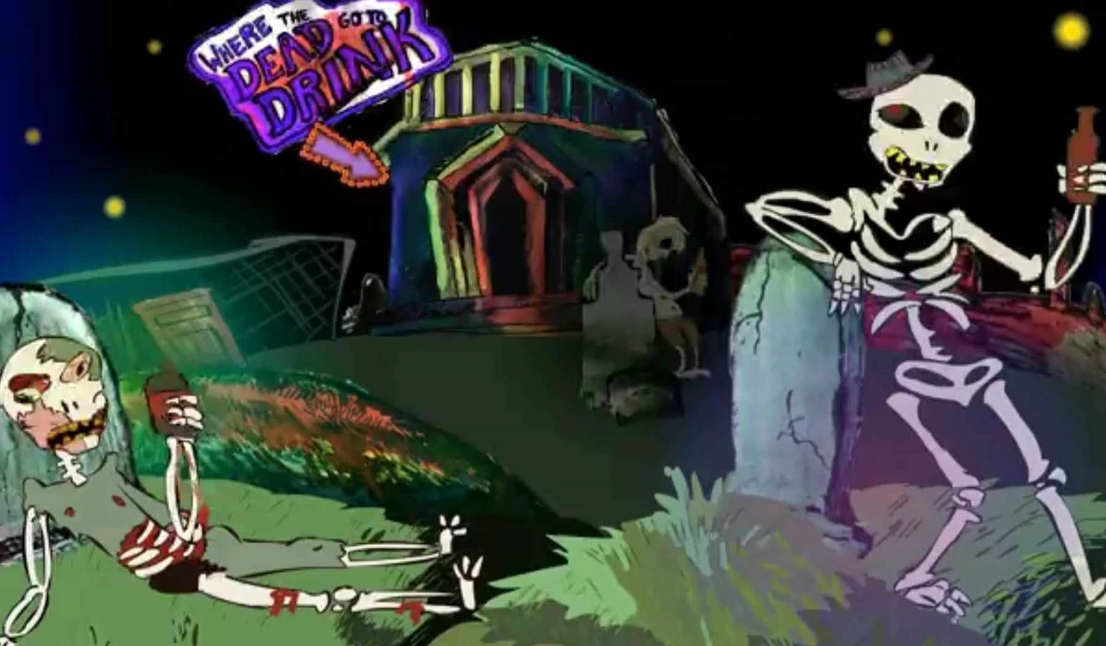 After being abandoned in the land of Where The Dead Go To Die by Labby, a heartbroken Alfred Alfer treks through the wasteland until he comes upon a cemetery littered with walking skeletons holding bottles of beer, all surrounding a large tomb with a neon sign reading "WHERE THE DEAD GO TO DRINK". Alfred enters the tomb, which is acting a booze joint, and takes a seat at the bar. As he mopes, the singers upon the stage sing distortedly, wail in agony and lumber around on the stage.