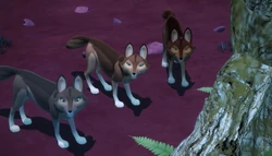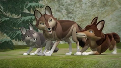 Howling at the Moon: One night in the desert, the four wolf cubs had a howling contest at the moon. Their howls attracted the attention of Widco, Kallisca, and Maslika, who were drinking nearby. The coyotes began to howl in turn, fooling the wolf cubs into thinking they were stray wolves. This allows them to find the cubs. Wahi tries to alert his friends, but having damaged his voice trying to howl as well, he is unable to do so. The coyotes begin to chase the group, but Wahi attracts the attention of Widco and Maslika and makes them slide onto Kallisca. Widco then helps Maslika get unstuck after he gets his head stuck in a tree trunk. The three coyotes manage to corner Wahi, but the cubs lure them straight into rattlesnakes, which scare them away.