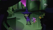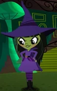 Like her two aunts and most witches, she has green skin. She also has black hair with green streaks, rosy cheeks and black eyes. She wears a purple dress with a black belt and a gold buckle, a purple witch hat with a black band, and a purple cape. She also wears a pair of black boots with heels and striped leggings in different shades of purple.