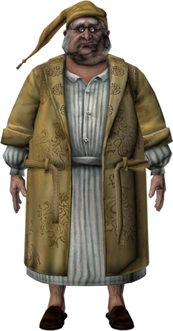Radcliffe is a obese elderly man. His hair is grey and has bushy eyebrows. He also sports mutton chops for facial hair, and wears glasses. In Alice's memories throughout the game his portrait depicts him in a fancy Victorian era suit. When Alice meets him in game, he's wearing a yellow robe with Chinese designs and symbols covering it. Underneath he has a white stripped pajamas on and wears a plain yellow nightcap, with brown slippers.