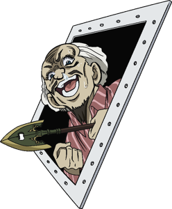 After shattering the camera, Jotaro attaches Yoshihiro's photo to a wall with a tack. Inside his photo, Yoshihiro pretends to suffocate, but Okuyasu doens't buy it and stabs more tacks into the photo. Suddenly, this gives the evil elder a window to escape via a string. After taking the Bow and Arrow, he declares he will create an army of Stand Users to keep Josuke and his team away from Yoshikage.