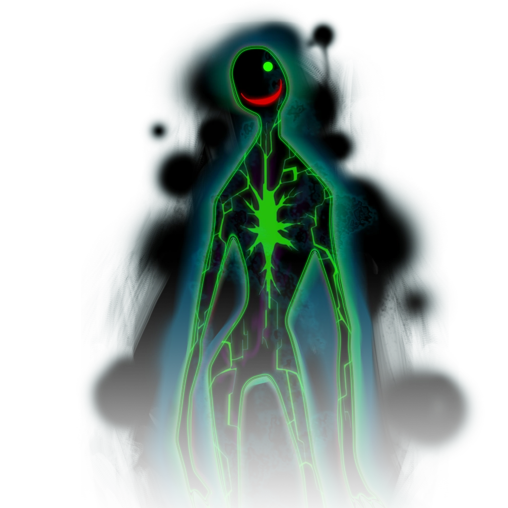As a ghost, Yuuki is a green and black humanoid figure with one eye and a large smile on his face.